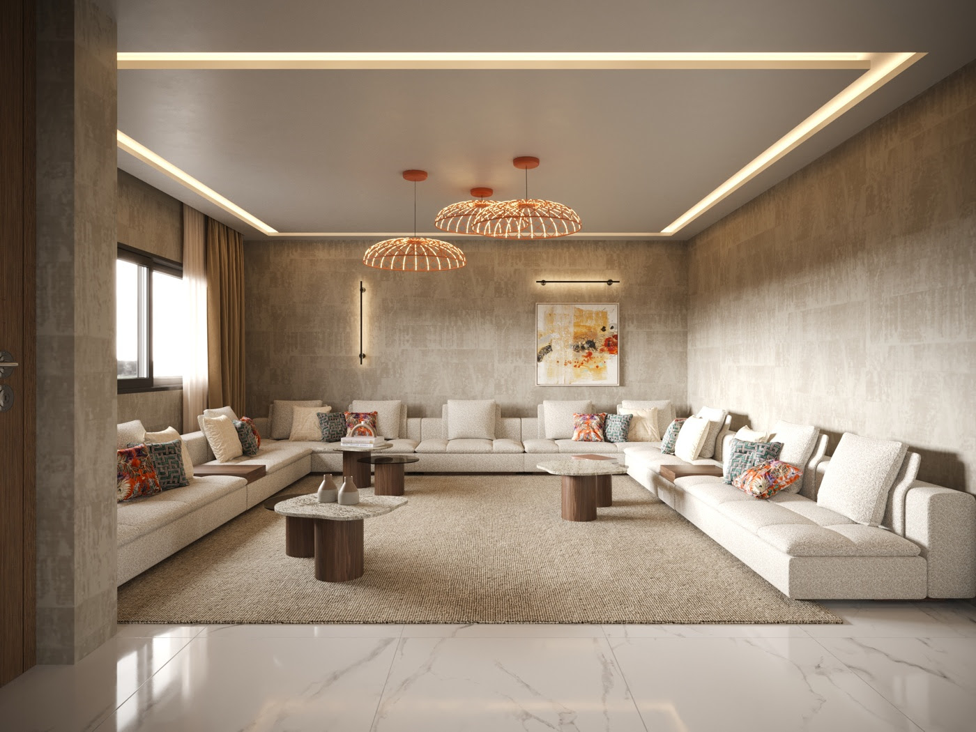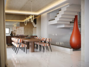 At its core is a spacious living room designed as a fusion of comfort and design. A palette of earthy tones is contrasted with polished marble surfaces and natural wood textures, creating an ambiance of understated opulence. The modular Landform Sofa offers a perfect blend of form and function, while the sculptural Her Coffee Table introduces layers and lines that energize the space.