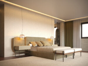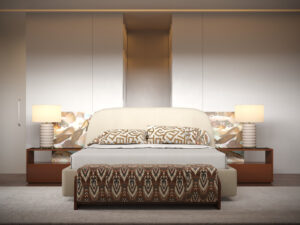 Drawing from the ornamental motifs of the Medina, the master bedroom merges contemporary elegance with artisanal detail. The Margem Bed, with curved lines and warm tones, sets a sensual tone, while the Her Bench, Her Night Table, and Toro Armchair enrich the room with layered textures, metallic accents, and subtle contrasts.